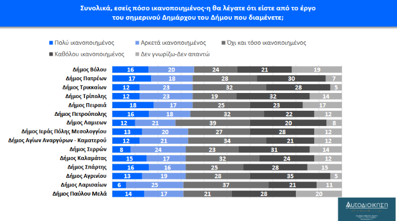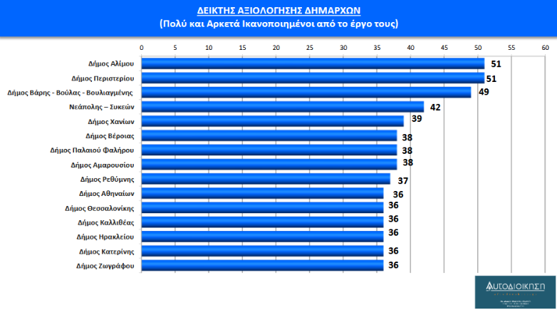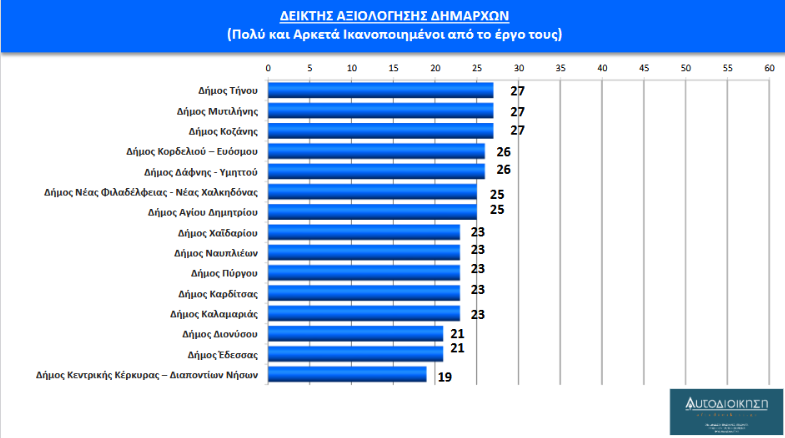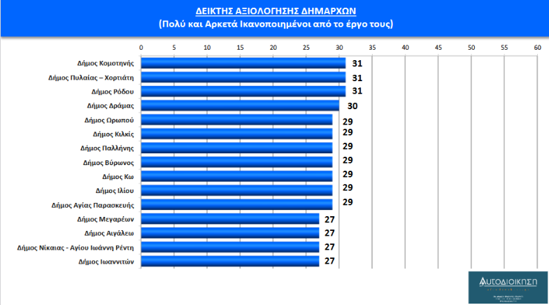 Την πρώτη θέση μοιράζονται οι δήμαρχοι Αλίμου Α. Κονδύλης και Περιστερίου Α. Παχατουρίδης με 51% («πολύ» και «αρκετά ικανοποιημένος»), ενώ την πρώτη τριάδα συμπληρώνει ο Γρ. Κωνσταντέλλος (3Β) με 49%. Στην τέταρτη θέση συναντάμε τον Σ. Δανιηλίδη (Νεάπολης – Συκεών) με 42%, στην πέμπτη τον Π. Σημανδηράκη των Χανίων με 39%, ενώ τρεις δήμαρχοι βρίσκονται στην έκτη θέση (Κ. Βοργιαζίδης-Βέροιας, Γ. Φωστηρόπουλος-Παλαιού Φαλήρου και Θ. Αμπατζόγλου-Αμαρουσίου) με 38%. Την ένατη θέση καταλαμβάνει ο δήμαρχος Ρεθύμνου Γ. Μαρινάκης με 37%, ενώ την δέκατη θέση με 36% μοιράζονται εφτά δήμαρχοι (Αθηναίων: Χ. Δούκας, Θεσσαλονίκης: Στ. Αγγελούδης, Καλλιθέας: Κ. Ασκούνης, Ηρακλείου: Α. Καλοκαιρινός, Κατερίνης: Γ. Ντούμος, Ζωγράφου: Τ. Καφατσάκη και Βολου: Α. Μπέος).