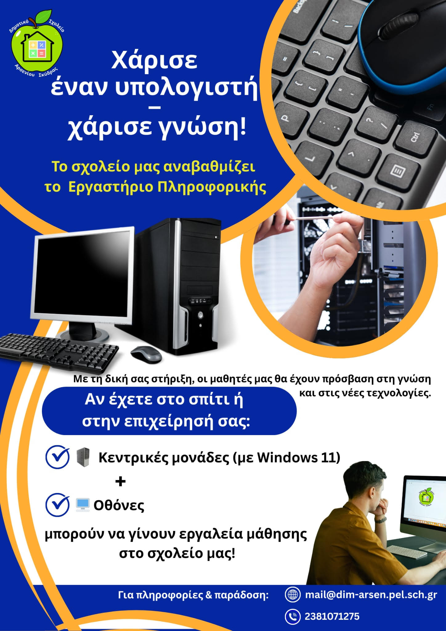 Στο πλαίσιο αυτό, καλούμε την τοπική κοινωνία να στηρίξει την προσπάθειά μας προσφέροντας κεντρικές μονάδες (με Windows 11) και οθόνες, σε καλή λειτουργική κατάσταση.