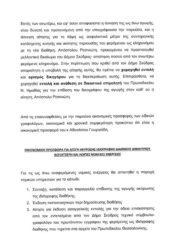 Η εμφάνιση μιας άλλης διαθήκης, λοιπόν, έχει περιπλέξει τα πράματα και τον λόγο θα έχει η δικαιοσύνη, αφού προηγουμένος ο Δήμος Σκύδρας πράξει τα απαραίτητα που σημαίνει γραφολογική εξέταση και πάει λέγοντας. Να σημειώσουμε, επίσης, ότι παραιτήθηκαν οι ορισθέντες της πρώτης διαθήκης εκτελεστές (μάλλον απηύδησαν οι άνθρωποι) και με επιμέλεια της Αποκεντρωμένης ορίστηκε ο Μητροπολίτης. Στο ΔΣ ήρθε η γνωμοδότηση δικηγόρου η οποία έγινε αποδεκτή ομοφώνως. Σας παρουσιάζουμε παρακάτω όλη την εισήγηση της για βαθύτερη γνώση του ζητήματος.