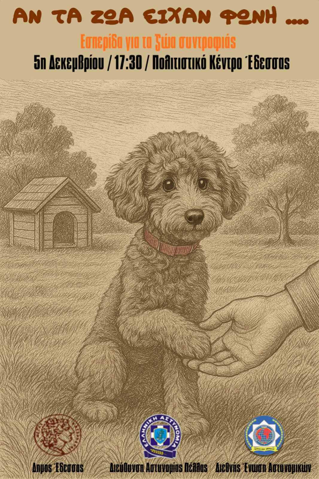 Μια ξεχωριστή εκδήλωση αφιερωμένη στα ζώα συντροφιάς θα πραγματοποιηθεί την Πέμπτη 5 Δεκεμβρίου, στις 17:30, στο Πολιτιστικό Κέντρο Έδεσσας. Με σύνθημα «Αν τα ζώα είχαν φωνή…», η εσπερίδα στοχεύει στην ενημέρωση και ευαισθητοποίηση των πολιτών σχετικά με την προστασία, τη φροντίδα και τα δικαιώματα των κατοικίδιων ζώων.