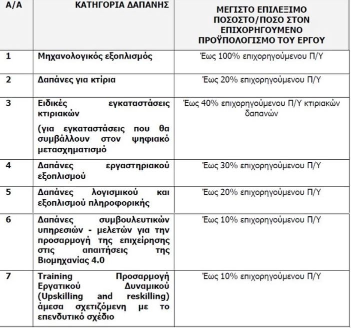 Επιδοτούνται επενδυτικά σχέδια πολύ μικρών, μικρών και μεσαίων επιχειρήσεων του ελληνικού βιομηχανικού οικοσυστήματος για την ενίσχυση της τεχνολογικής τους υποδομής και την αναβάθμιση του κατασκευαστικού τους εξοπλισμού με χρήση έξυπνων τεχνολογιών αιχμής με χαμηλές περιβαλλοντικές επιπτώσεις.