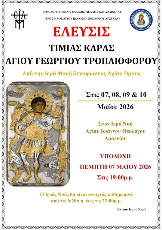 Η υποδοχή της Τιμίας Κάρας του Αγίου Γεωργίου του Τροπαιοφόρου θα πραγματοποιηθεί την Πέμπτη 7 Μαΐου στις 7:00 μ.μ. και εν συνεχεία θα τελεστεί Μέγας Πανηγυρικός Εσπερινός μετ' αρτοκλασίας του Αγίου Ιωάννου Θεολόγου ενώπιον της χαριτοβρύτης Τιμίας Κάρας και θα ακολουθήσει Ιερά Λιτανεία.
