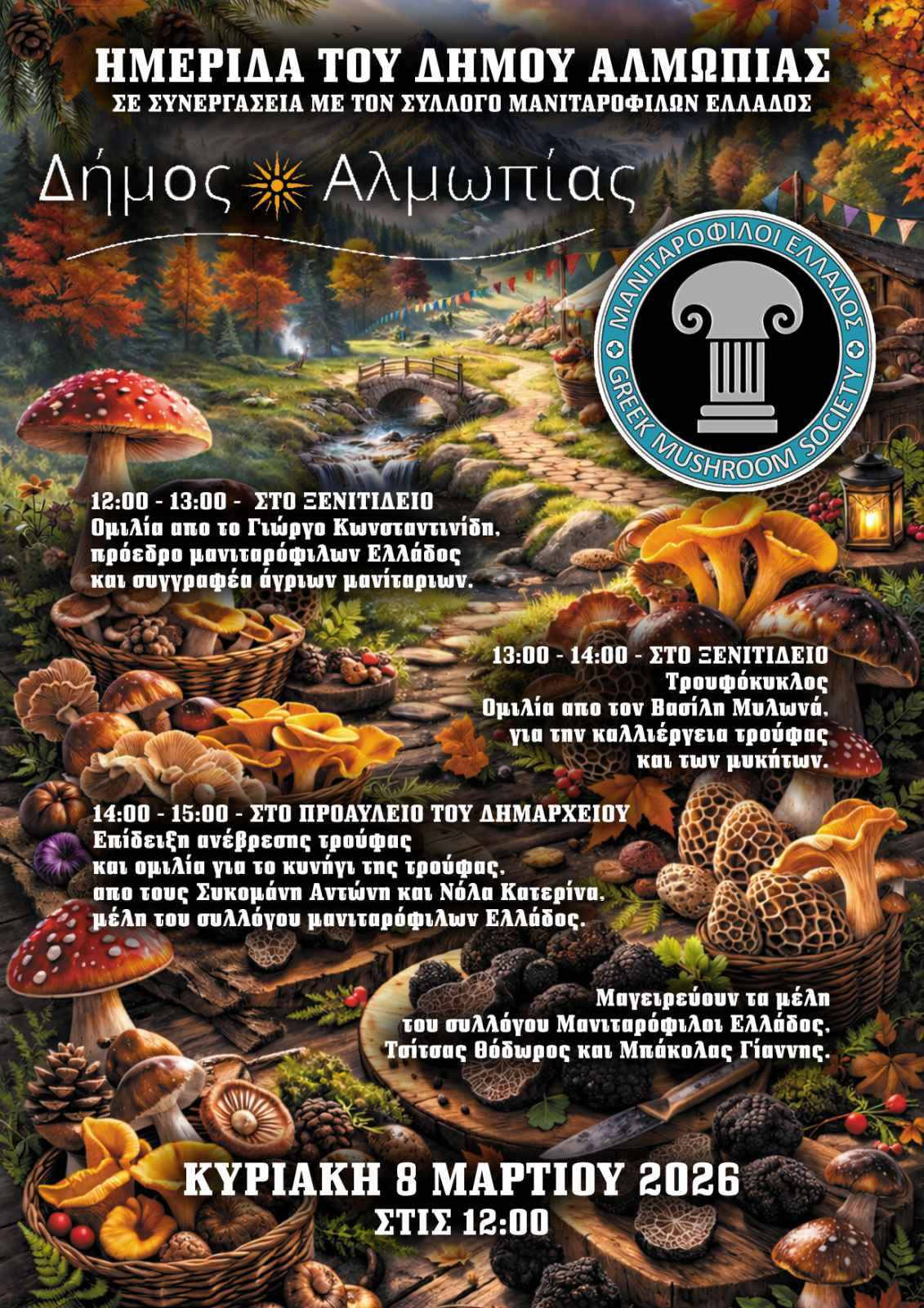 Ο Δήμος Αλμωπίας σας προσκαλεί σε μια ξεχωριστή ημέρα γεμάτη γνώση, αρώματα και γεύσεις από τον μαγικό κόσμο των μανιταριών. Σε συνεργασία με τον Σύλλογο Μανιταρόφιλων Ελλάδος, θα ανακαλύψουμε τα μυστικά των άγριων μανιταριών και της τρούφας μέσα από ενδιαφέρουσες ομιλίες, παρουσιάσεις και ζωντανές επιδείξεις.