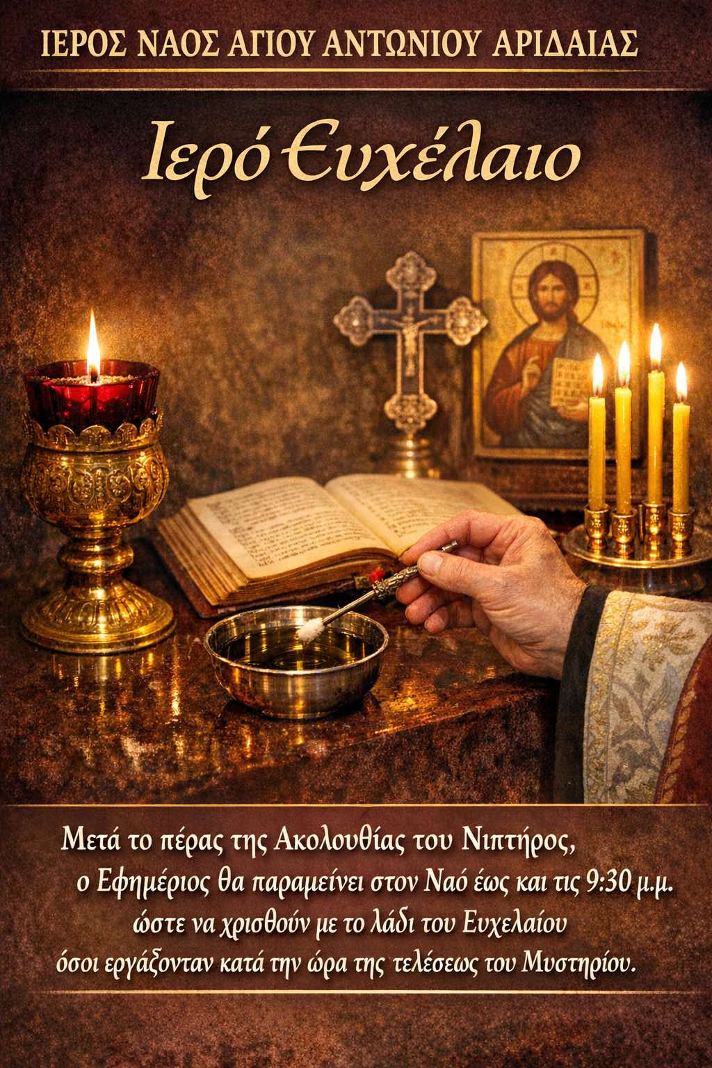 Σε κλίμα κατάνυξης και βαθιάς πνευματικότητας θα πραγματοποιηθεί την Μεγάλη Τετάρτη η Ακολουθία του Ιερού Ευχελαίου στον Ιερό Ναό Αγίου Αντωνίου στην Αριδαία, συγκεντρώνοντας πλήθος πιστών από την ευρύτερη περιοχή.