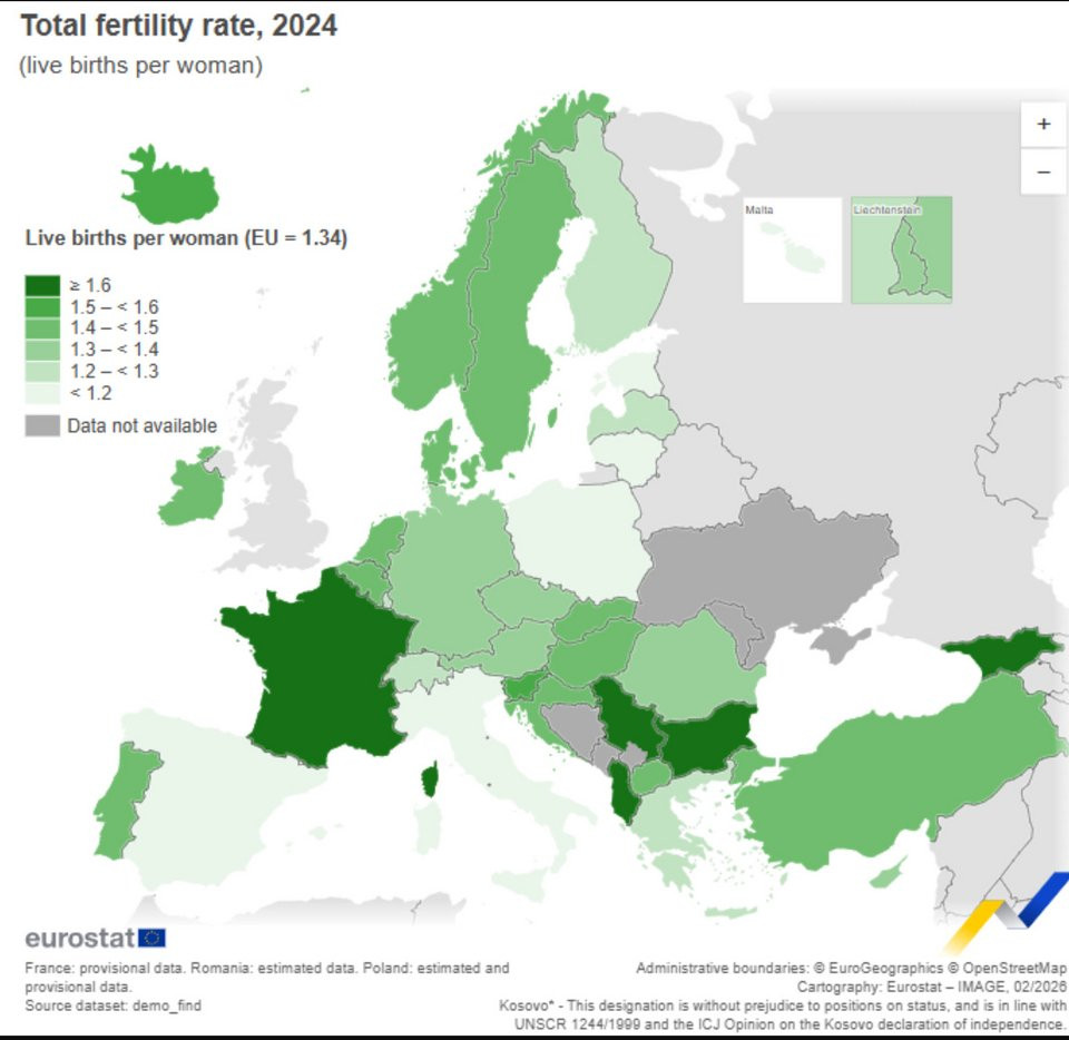 Σύμφωνα με τη Eurostat, tο 2024, γεννήθηκαν 3,55 εκατομμύρια μωρά στην ΕΕ , σημειώνοντας μείωση 3,3% από τα 3,67 εκατομμύρια το 2023. Το συνολικό ποσοστό γονιμότητας για το 2024 ήταν 1,34 γεννήσεις ζώντων μωρών ανά γυναίκα στην ΕΕ, από 1,38 το 2023. Αυτό είναι το χαμηλότερο ποσοστό από το 2001, το πρώτο έτος για το οποίο είναι διαθέσιμη η τιμή της ΕΕ.
