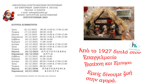 Χριστουγεννιάτικο Εορταστικό Ωράριο Καταστημάτων στο Ν. Πέλλας