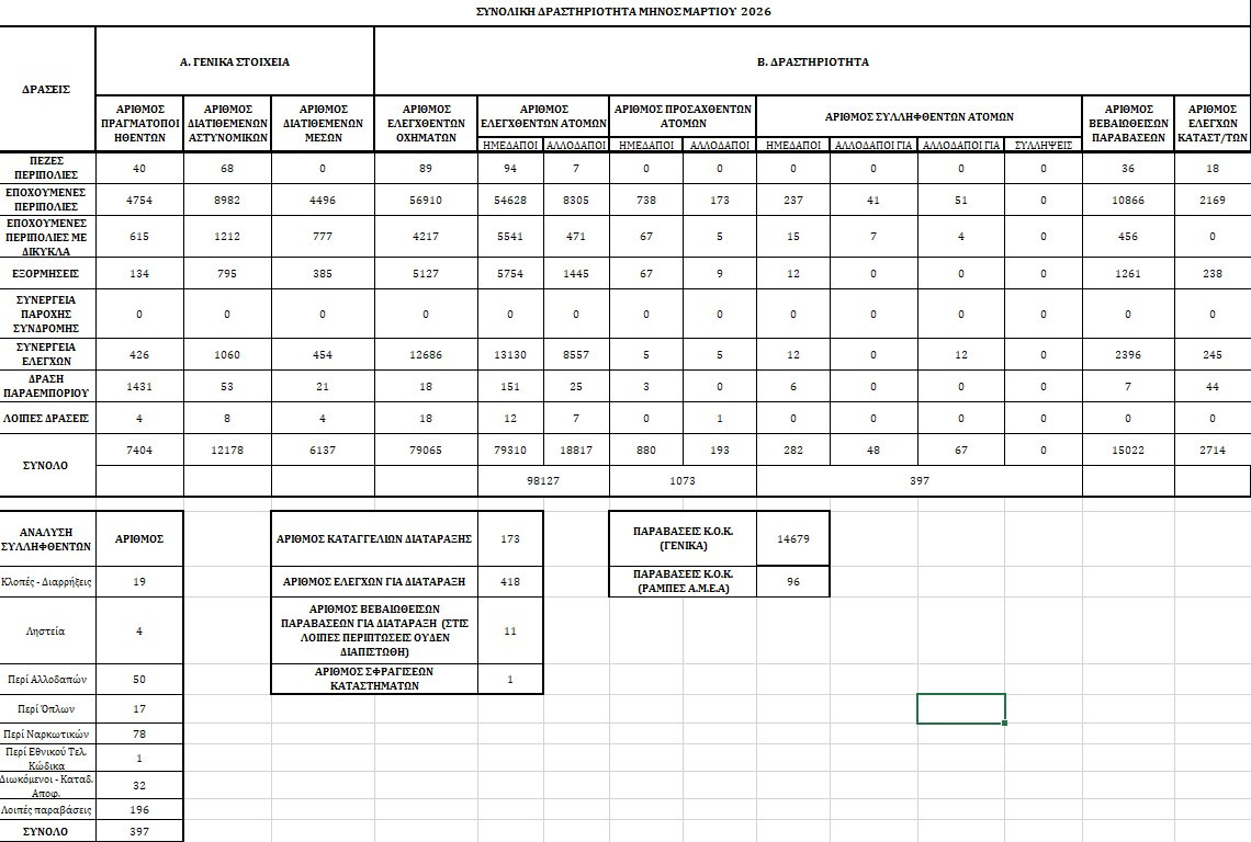 Στο πλαίσιο των τροχονομικών δράσεων, τον μήνα Μάρτιο του έτους 2026, βεβαιώθηκαν μεταξύ άλλων και -2.921- παραβάσεις ως ακολούθως: