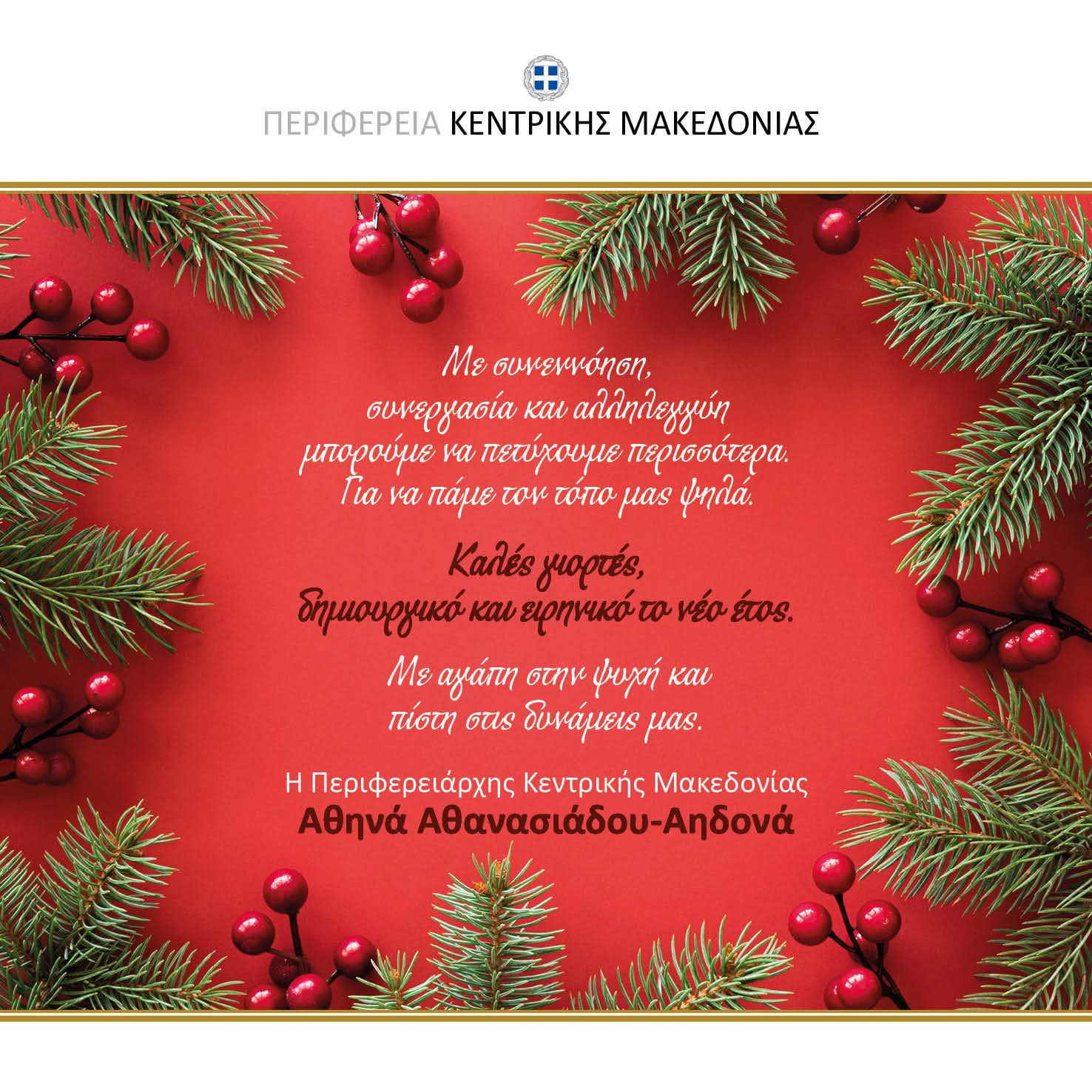 Με μήνυμα ενότητας, συνεργασίας και αισιοδοξίας, οι εορταστικές ευχές της Περιφερειάρχη Κεντρικής Μακεδονίας Αθηνά Αθανασιάδου-Αηδονά ξεχωρίζουν για το περιεχόμενο και τον συμβολισμό τους, στέλνοντας ένα σαφές στίγμα για τη φιλοσοφία διοίκησης και την προοπτική της νέας χρονιάς.