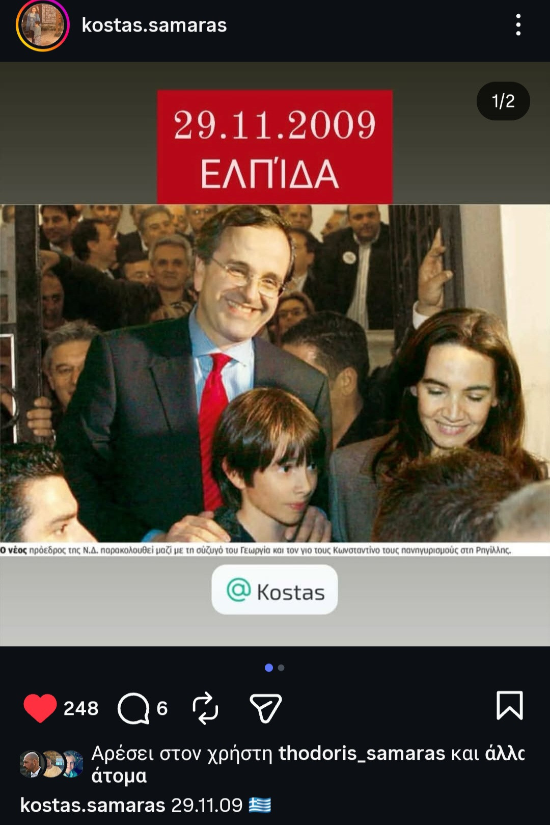 Μια ανάρτηση με έντονο συμβολισμό δημοσίευσε ο Κώστας Σαμαράς στον προσωπικό του λογαριασμό στο Instagram, υπενθυμίζοντας την ημερομηνία 29 Νοεμβρίου 2009, συνοδευόμενη από τη λέξη «Ελπίδα». Η δημοσίευση περιλαμβάνει φωτογραφικό υλικό από εκείνη την περίοδο, όπου καταγράφεται κλίμα ενθουσιασμού και συγκίνησης μέσα σε πλήθος ανθρώπων.