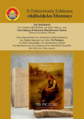 Σε συνεργασία με τον Πολιτιστικό Σύλλογο «Βιβλιόφιλοι Έδεσσας», θα πραγματοποιηθεί παρουσίαση του βιβλίου «Το Πείσμα» του συγγραφέα Ορφέα Αργυρού. Το έργο βασίζεται σε αληθινή ιστορία με στοιχεία μυθιστορήματος, τοποθετημένη χρονικά στο τέλος του 19ου και στις αρχές του 20ού αιώνα, στη Στενήμαχο της Ανατολικής Ρωμυλίας. Το βιβλίο περιλαμβάνει ιστορικά και λαογραφικά στοιχεία της εποχής, ενώ κατά την εκδήλωση θα προβληθεί οπτικοακουστικό υλικό (διαφάνειες – μουσική – αρχειακές φωτογραφίες).