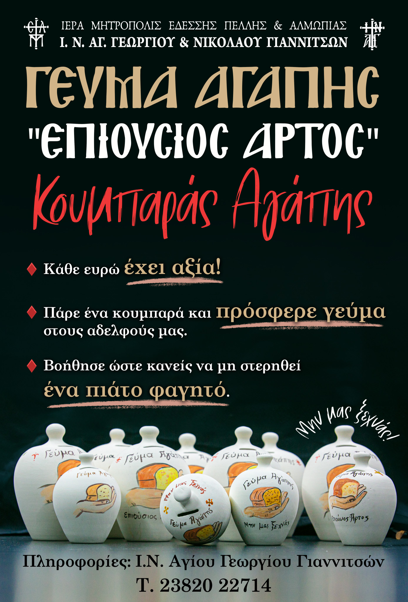 Ένας μικρός πήλινος κουμπαράς μπορεί να φαίνεται ταπεινός, όμως κρύβει μέσα του μια απέραντη δύναμη: τη δύναμη της αγάπης και της αλληλεγγύης. Στον «Κουμπαρά Αγάπης» του Γεύματος Αγάπης «Επιούσιος Άρτος» της ενορίας Αγίου Γεωργίου Γιαννιτσών, κάθε ευρώ μεταμορφώνεται σε ένα πιάτο ζεστό φαγητό και σε ένα χαμόγελο για έναν συνάνθρωπο που το έχει ανάγκη.
