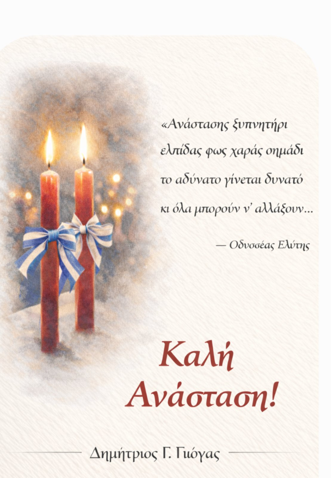 Σε δήλωσή του, ο κ. Γιώγας τονίζει τη βαθιά συμβολική σημασία της Ανάστασης, υπογραμμίζοντας πως πρόκειται για μια περίοδο που εμπνέει πίστη και δύναμη για ένα καλύτερο αύριο. «Η Ανάσταση αποτελεί το ξύπνημα της ελπίδας και το φως που οδηγεί σε μια νέα αρχή», σημειώνει, καλώντας τους πολίτες να διατηρήσουν την ενότητα και την αλληλεγγύη.