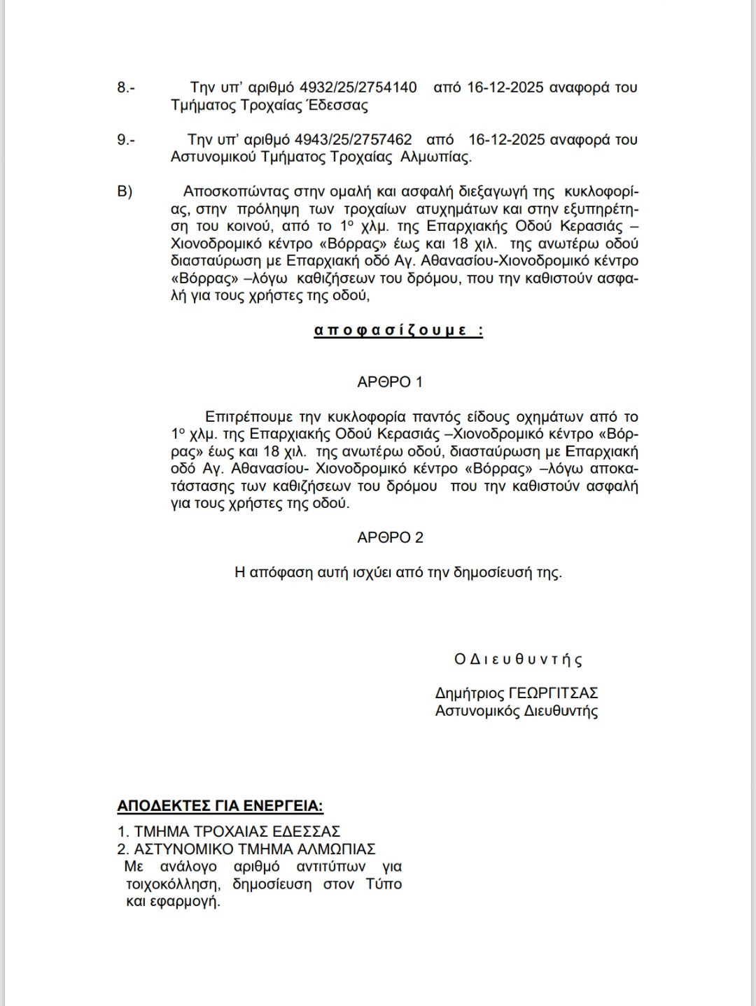 Με συνεργασία με τις τεχνικές υπηρεσίες, αξιοποίηση των αρμόδιων εισηγήσεων και απόλυτο σεβασμό στη νομιμότητα και την ασφάλεια, ο Αστυνομικός Διευθυντής Πέλλας στάθηκε στο ύψος των περιστάσεων. Η συγκεκριμένη απόφαση αποτελεί παράδειγμα αποτελεσματικής διοίκησης και υπεύθυνης ηγεσίας.