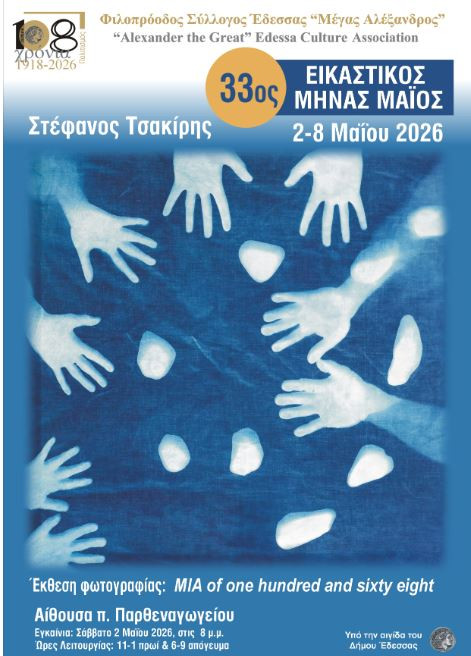 Ο Φιλοπρόοδος Σύλλογος Έδεσσας «Μέγας Αλέξανδρος» διοργανώνει εδώ και 33 χρόνια τον Εικαστικό Μήνα Μάιο, ένα θεσμό που πλέον αποτελεί σημείο αναφοράς για τα εικαστικά δρώμενα της πόλης και όχι μόνο.