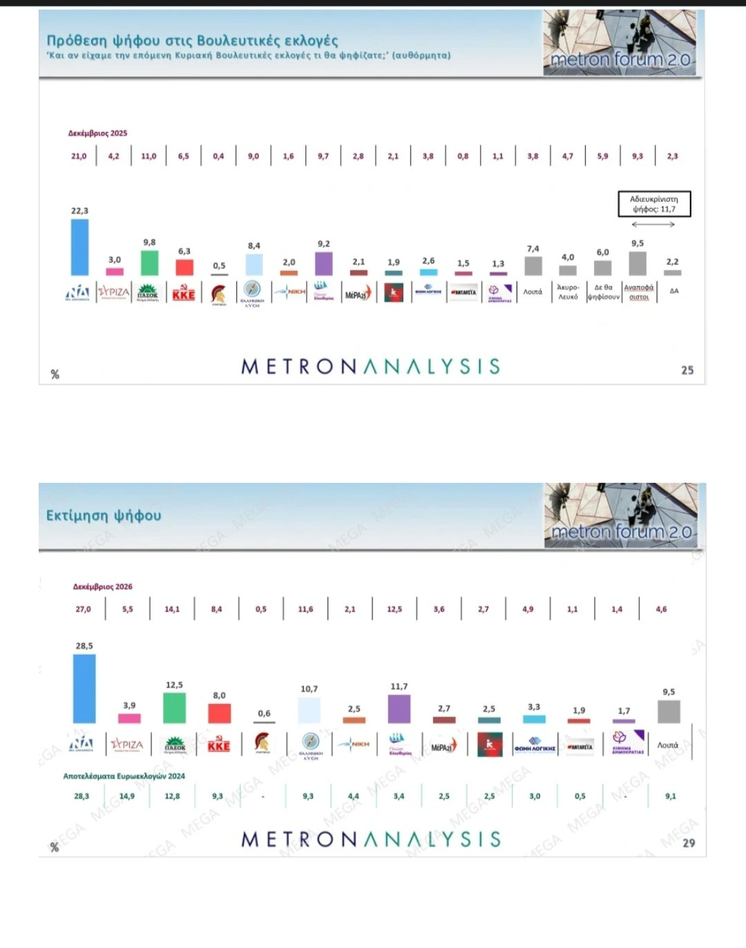 Σύμφωνα με την έρευνα της Metron Analysis, η Νέα Δημοκρατία συγκεντρώνει 28,5% στην πρόθεση ψήφου, σημειώνοντας άνοδο 1,5 μονάδας σε σχέση με τον Δεκέμβριο. Παρά το γεγονός ότι το αίτημα για «πολιτική αλλαγή» παραμένει υψηλό στην κοινωνία (61%), το κυβερνών κόμμα καταφέρνει να διευρύνει τη διαφορά του από το δεύτερο ΠΑΣΟΚ στις 16 μονάδες, κεφαλαιοποιώντας τη στασιμότητα και τη σύγχυση στον χώρο της αντιπολίτευσης.