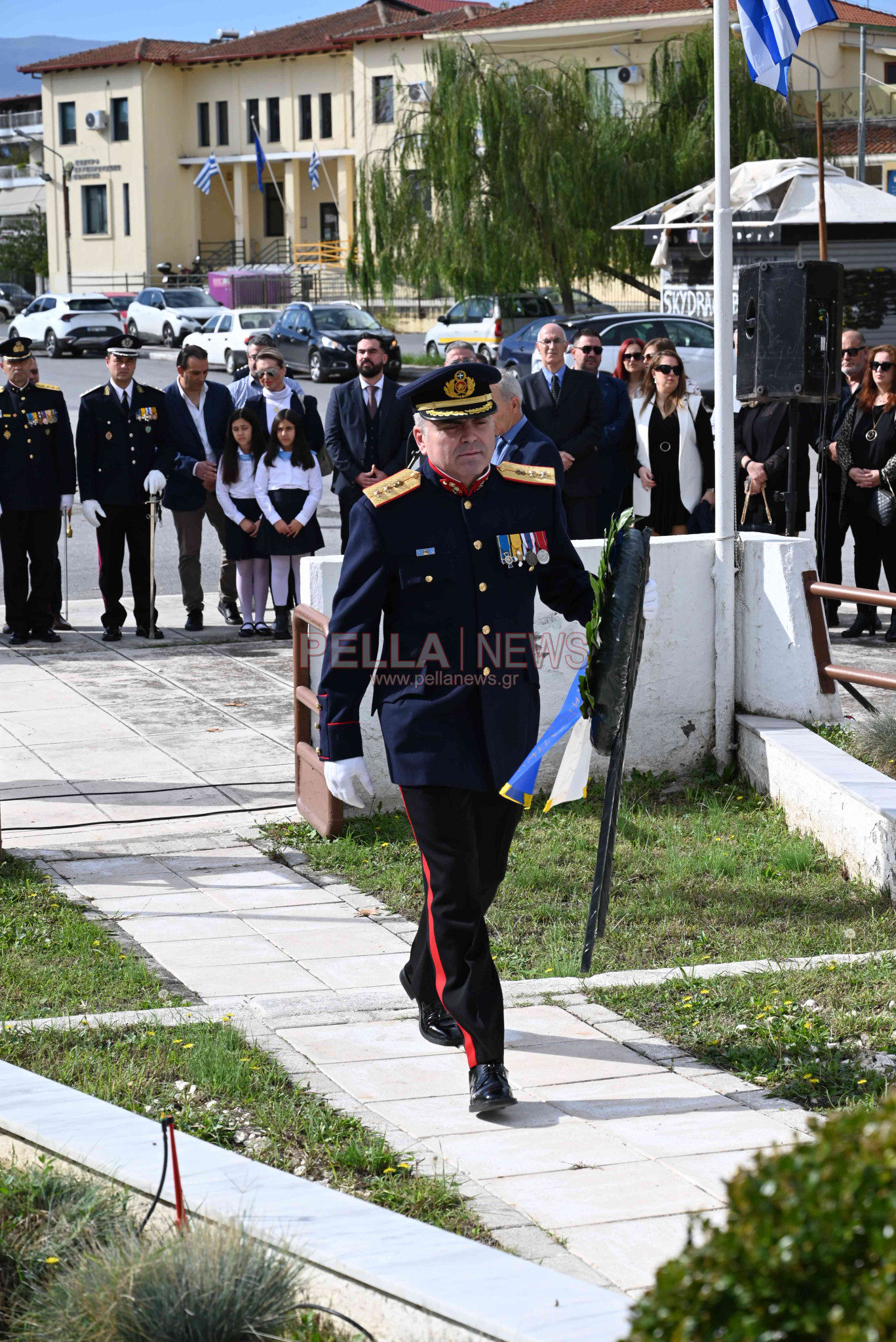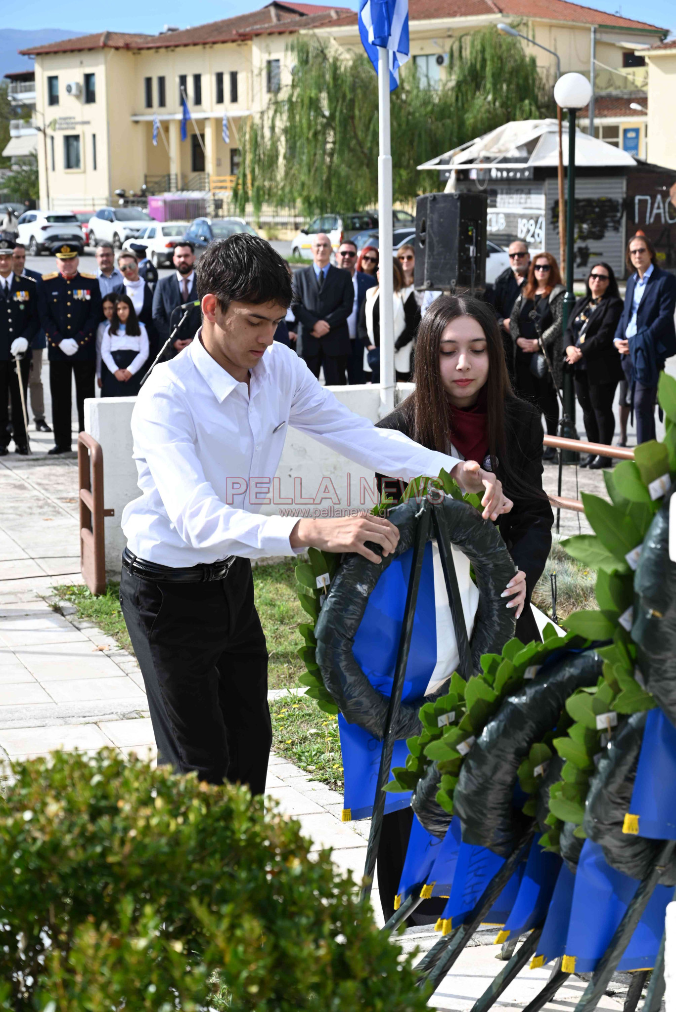 Ακολούθησε κατάθεση στεφάνων από τη Δήμαρχο Σκύδρας, Εκπρόσωπο της Περιφερειακής Ενότητας Πέλλας, Εκπρόσωπο του Στρατηγού – Διοικητή ΙΙας Μηχανοκίνητης Μεραρχίας Πεζικού, Διοικητή Αστυνομικού Τμήματος Σκύδρας, Διοικητή Πυροσβεστικής Υπηρεσίας, Πρόεδρο κοινότητας Σκύδρας για την Εθνική Αντίσταση 1941 – 1944, Σύνδεσμο Απόστρατων Αξιωματικών Στρατού Ν. Πέλλας, Εκπρόσωπο Ειδικού Γυμνασίου και Λυκείου Σκύδρας, Εκπρόσωπο του Γενικού Λυκείου Σκύδρας, Εκπρόσωπο του Γυμνασίου Σκύδρας, Εκπρόσωπο του 1ου Δ.Σ. Σκύδρας, Εκπρόσωπο του 2ου Δ.Σ. Σκύδρας, Εκπρόσωποι Συλλόγων