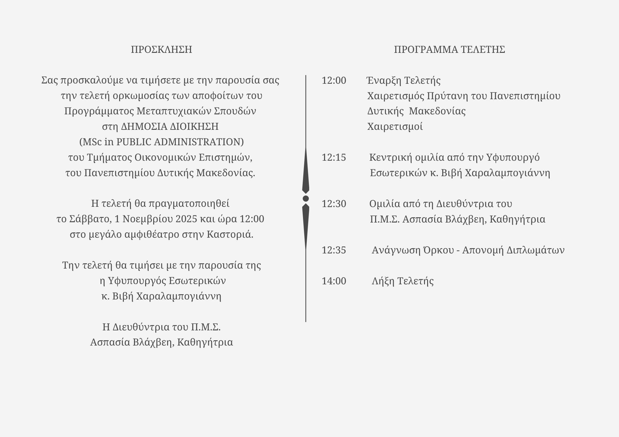 Το Σάββατο, 1 Νοεμβρίου 2025, και ώρα 12:00 μ.μ., θα πραγματοποιηθεί η τελετή ορκωμοσίας των αποφοίτων του Προγράμματος Μεταπτυχιακών Σπουδών στη Δημόσια Διοίκηση (MSc in Public Administration) του Τμήματος Οικονομικών Επιστημών του Πανεπιστημίου Δυτικής Μακεδονίας, στο Μεγάλο Αμφιθέατρο στην Καστοριά.