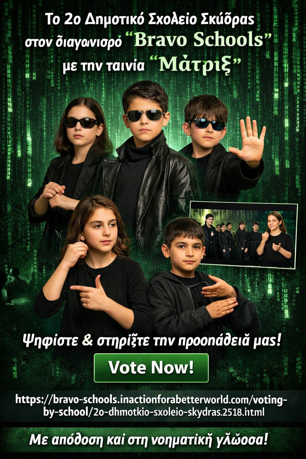 Με μια δημιουργική και κοινωνικά ευαισθητοποιημένη συμμετοχή, το 2ο Δημοτικό Σχολείο Σκύδρας λαμβάνει μέρος στον πανελλήνιο διαγωνισμό «Bravo Schools», παρουσιάζοντας την πρωτότυπη μαθητική ταινία με τίτλο «Μάτριξ».