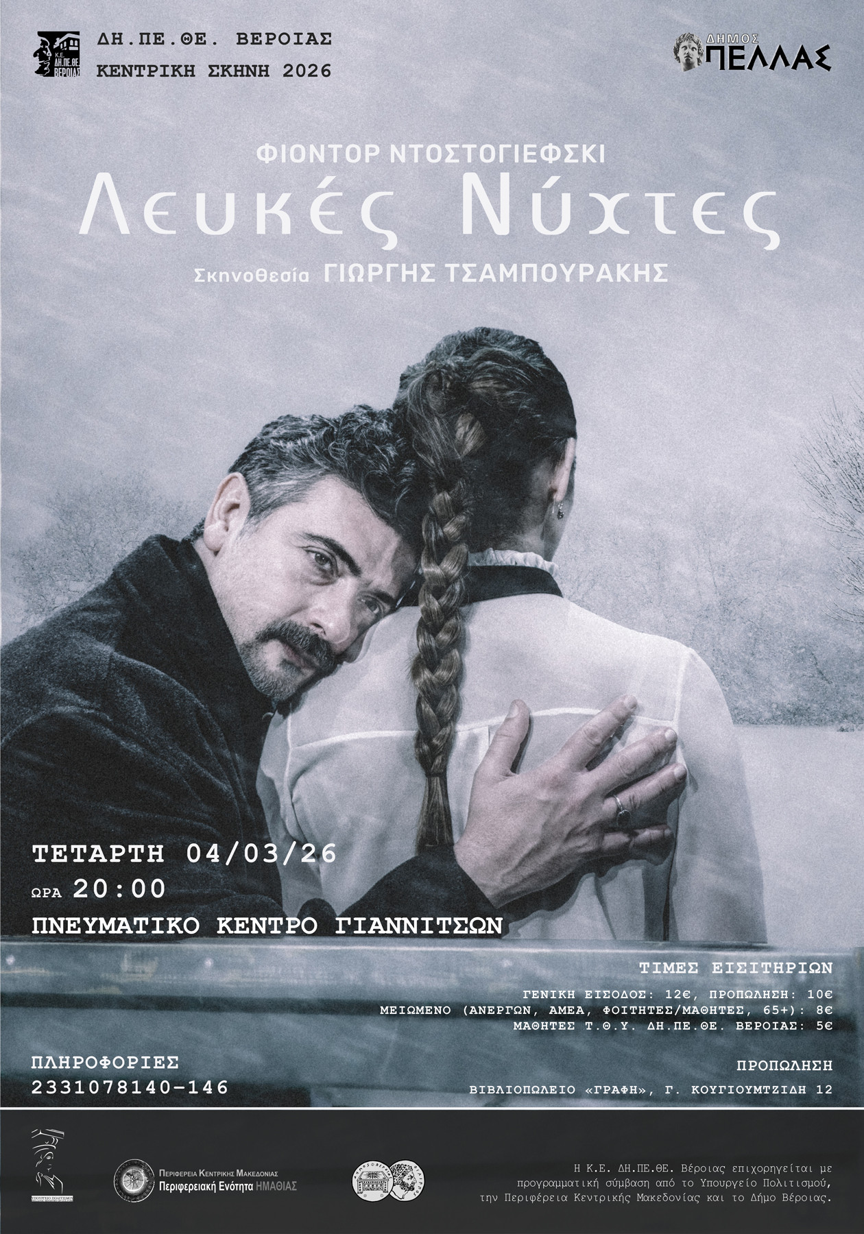 Το ΔΗ.ΠΕ.ΘΕ. Βέροιας παρουσιάζει στα Γιαννιτσά το αριστουργηματικό έργο του Φιοντόρ Ντοστογιέφσκι, Λευκές Νύχτες, σε σκηνοθεσία και ερμηνεία Γιωργή Τσαμπουράκη. Η θεατρική διασκευή του έργου, την οποία συνυπογράφει ο σκηνοθέτης με την Κατερίνα Χάλκου και την Καλλιόπη Σίμου, θα παρουσιαστεί στο Πνευματικό Κέντρο Γιαννιτσών, την Τετάρτη 4 Μαρτίου στις 20:00.
