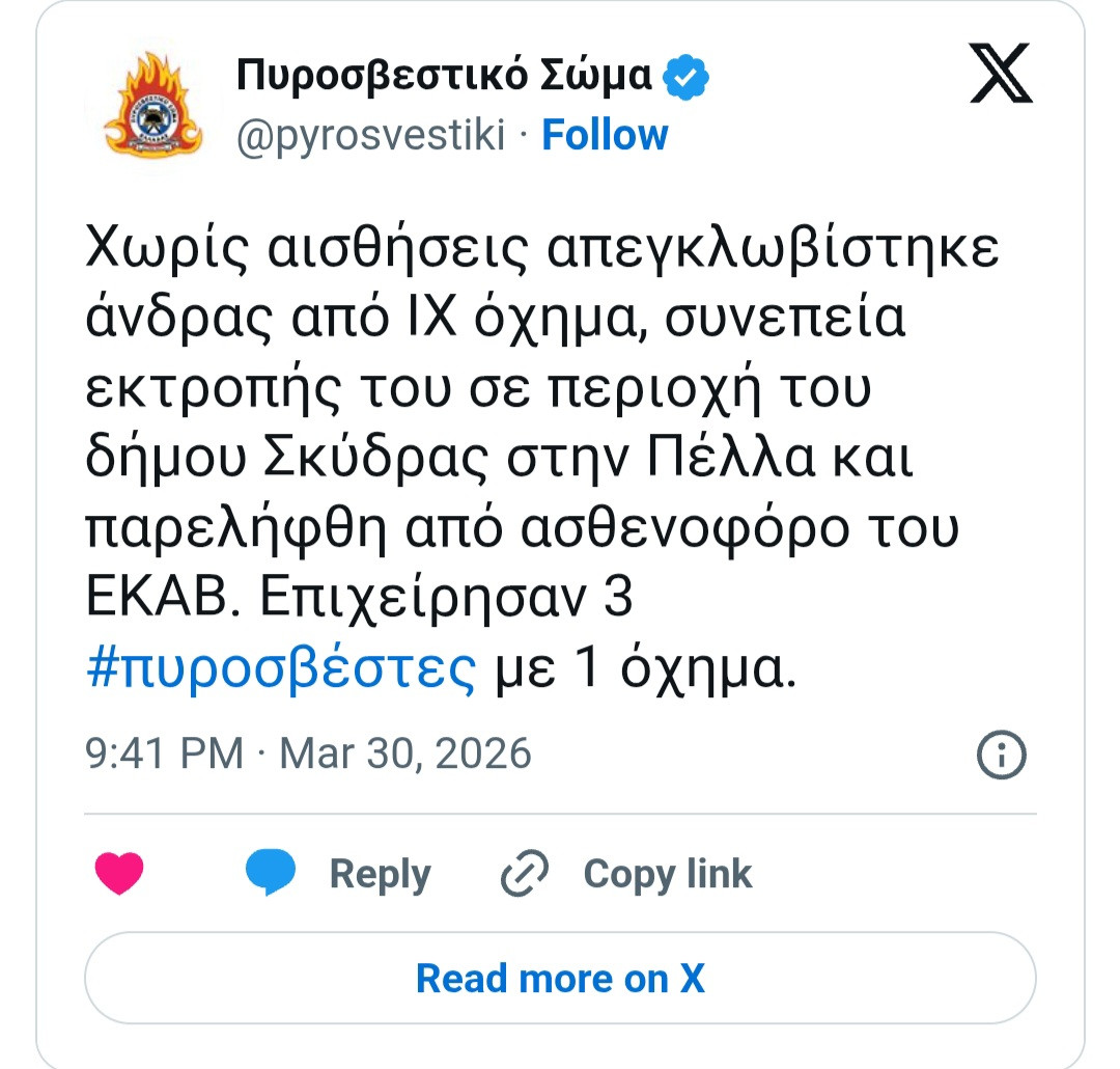 Ένας άνδρας 54 ετών ανασύρθηκε χωρίς τις αισθήσεις του από το όχημά του στην Πέλλα, ύστερα από εκτροπή που σημειώθηκε το βράδυ της Δευτέρας, κοντά στο χωριό Ρίζο του δήμου Σκύδρας.