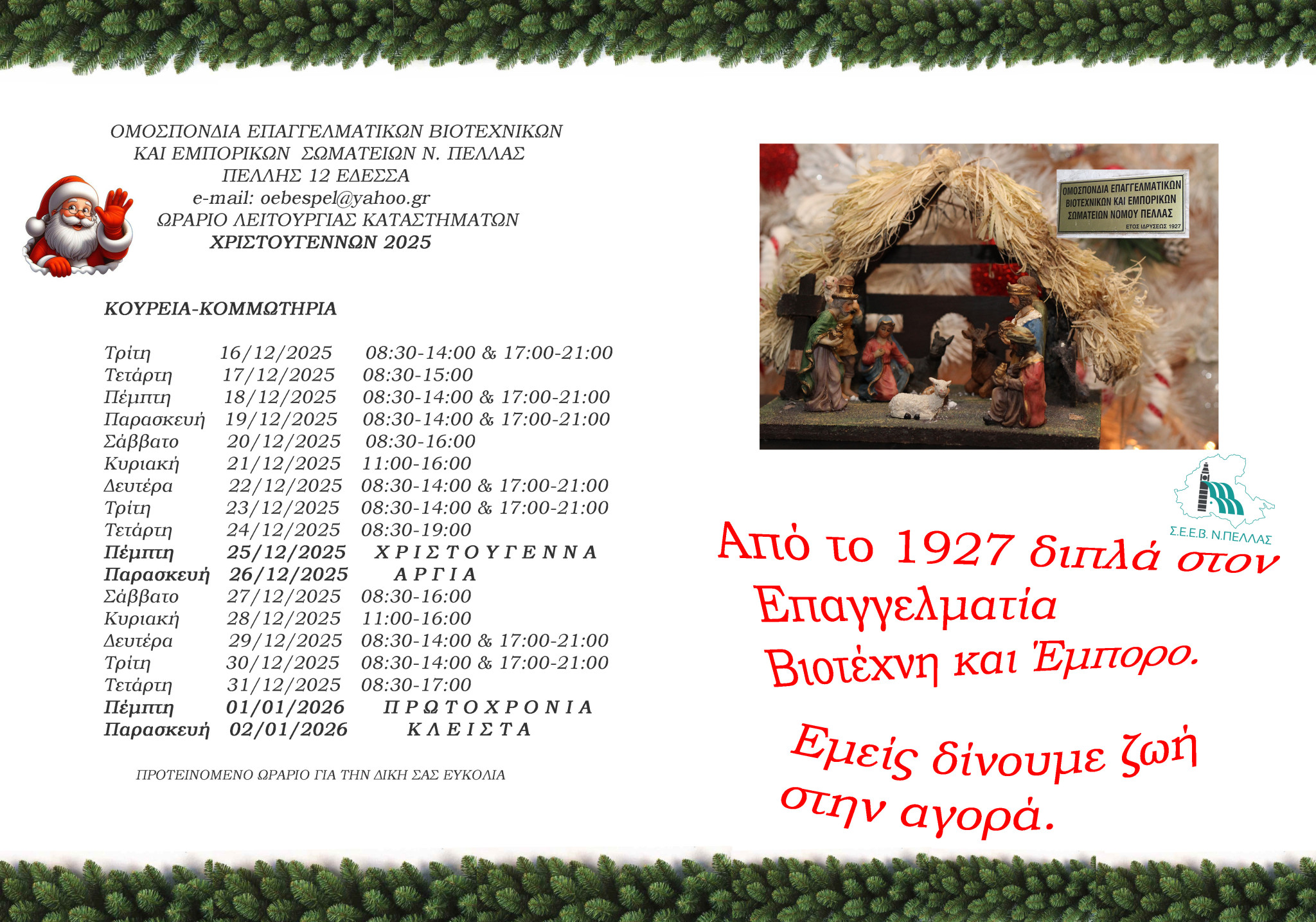 Η Ομοσπονδία Επαγγελματικών Βιοτεχνικών και Εμπορικών Σωματείων Ν. Πέλλας ανακοινώνει το Χριστουγεννιάτικο Εορταστικό Ωράριο 2025–2026 για τα εμπορικά καταστήματα, τα παντοπωλεία–κρεοπωλεία–ιχθυοπωλεία–οπωροπωλεία, καθώς και τα κουρεία–κομμωτήρια. Το προτεινόμενο ωράριο στοχεύει στη διευκόλυνση των καταναλωτών κατά την περίοδο των γιορτών, αλλά και στην ομαλή λειτουργία της τοπικής αγοράς.